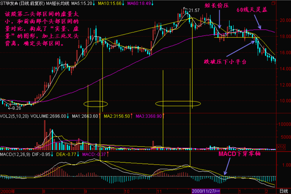 这就构成了三死叉见顶的图形,价死叉位置抬高,而量死叉、MACD死叉位置降低。
