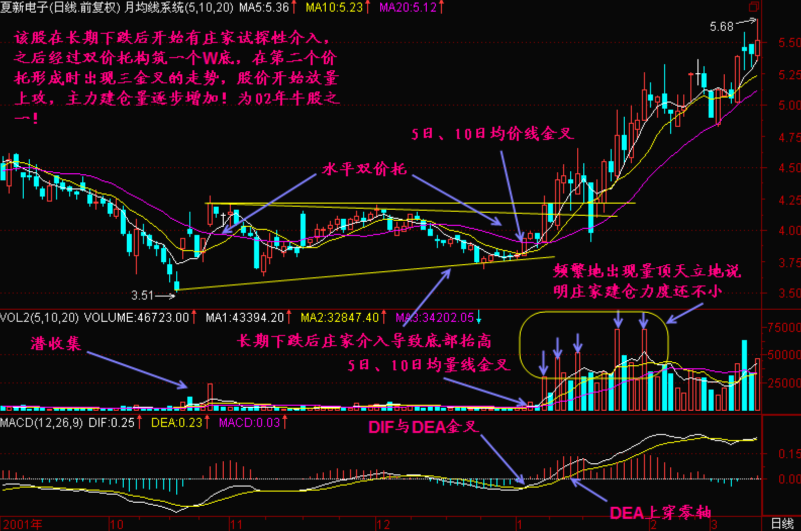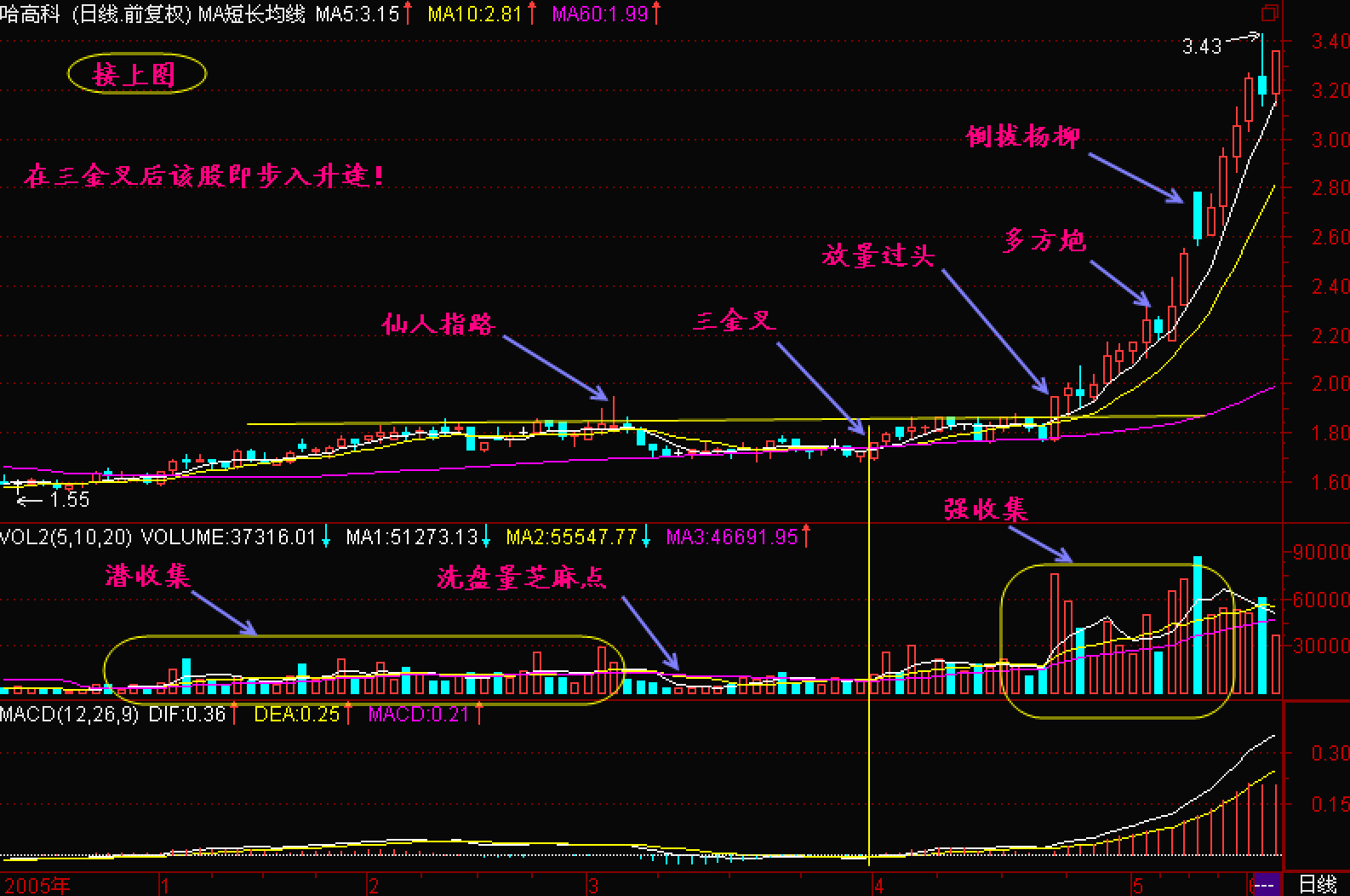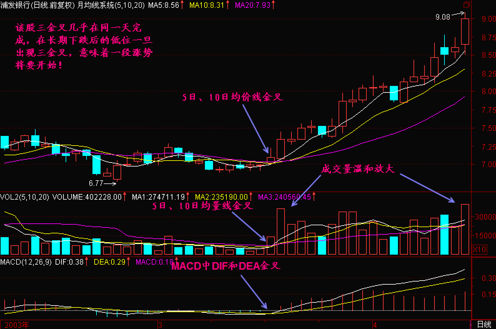 小结:三金叉说明价格、量、MACD都在一个时点附近同时发生良性共振,一般情况下都有一波上扬行情。