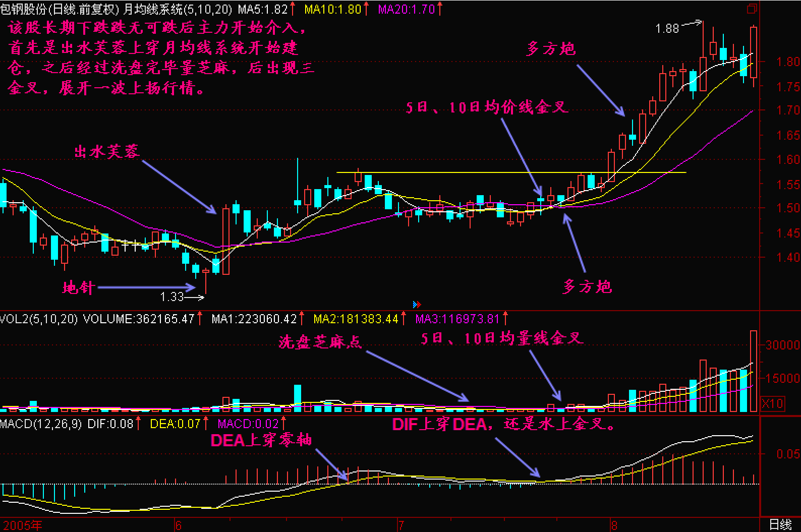 股价在长期下跌后开始启稳筑底,而后股价缓慢上升。有时会同时出现5日、10日均价线、5日、10日均量线和MACD的黄金交叉点,这是股价见底回升的信号。