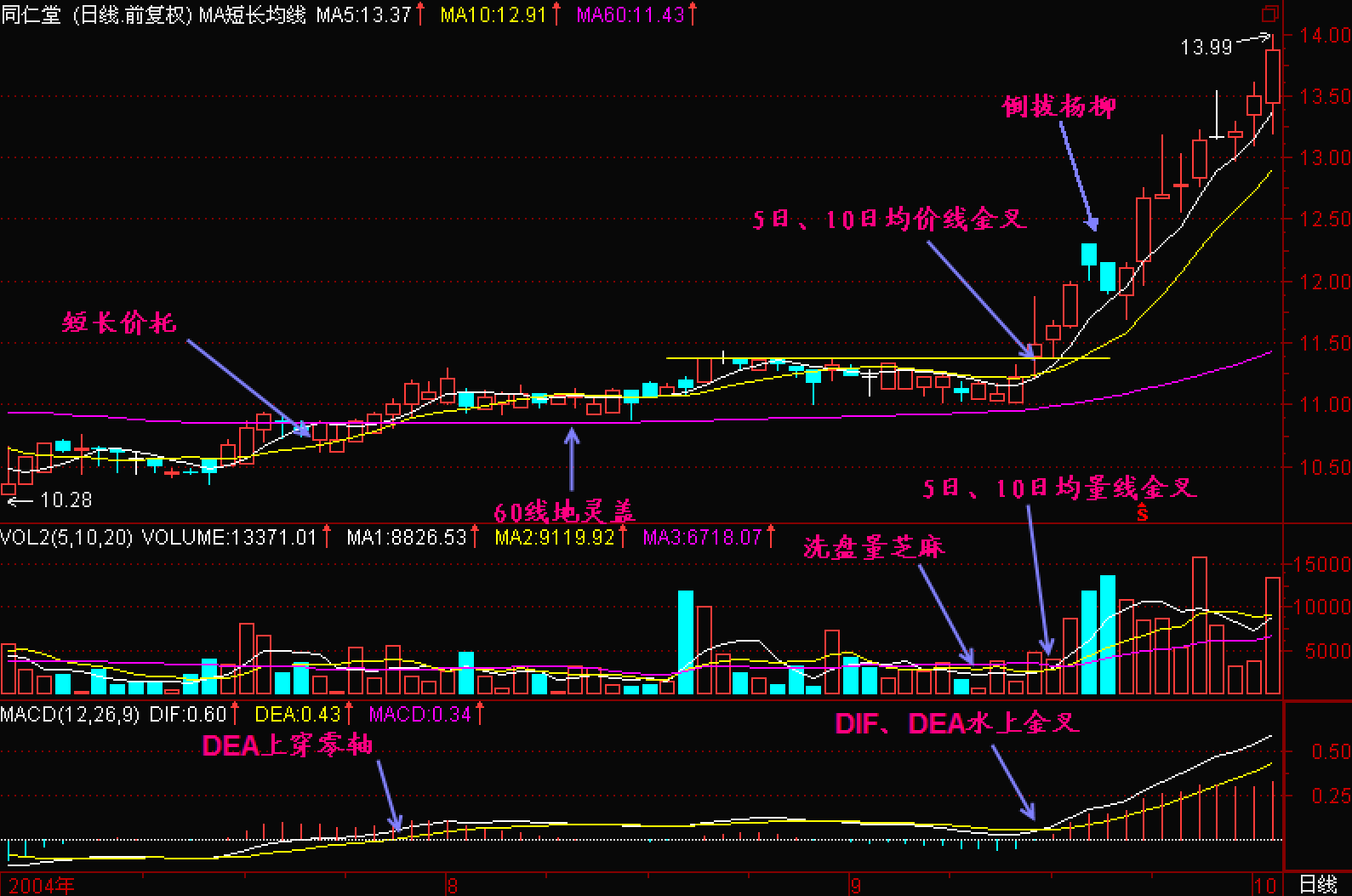 当成交量继续放大推动股价上行时,5日、10日价均线、量均线和MACD自然发生黄金交叉。