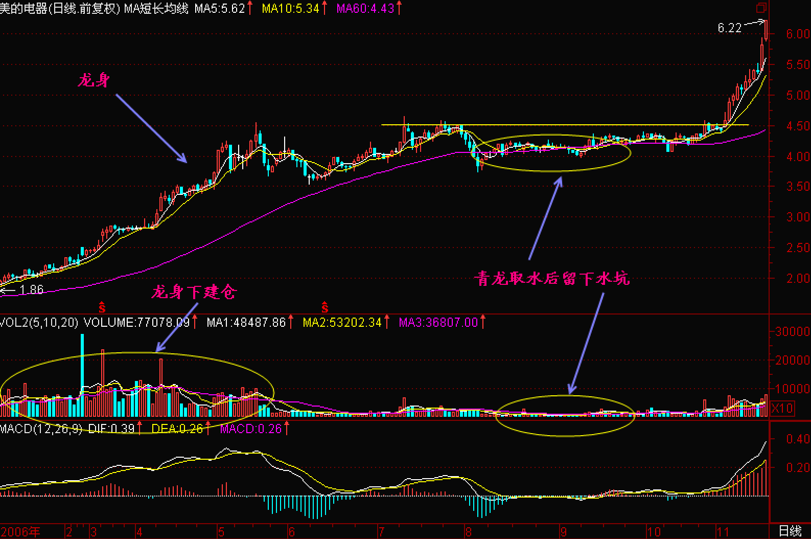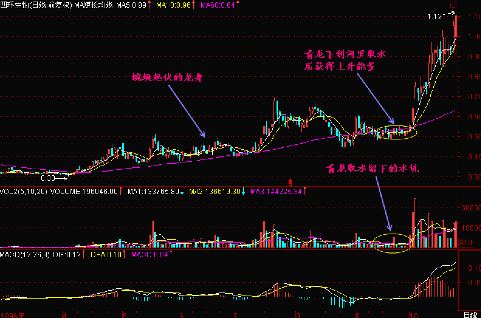 然后龙头回到60日均线附近,犹如青龙入河取水。同时在成交量柱体图上会出现一群量芝麻点,犹如取水后留下的水坑。