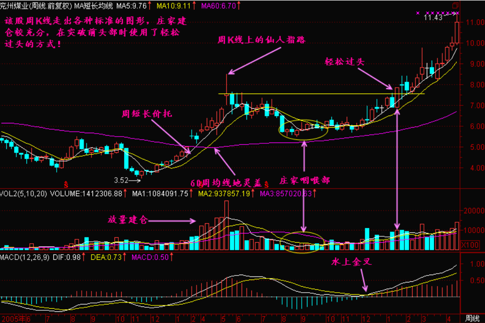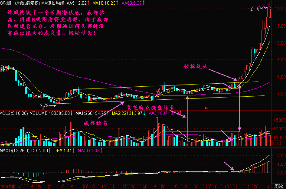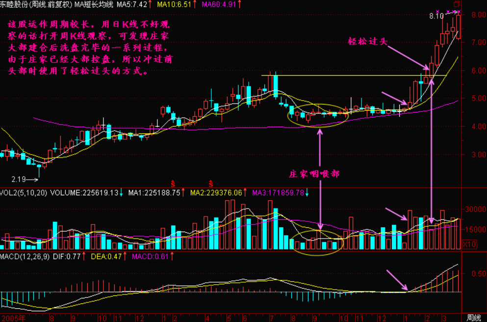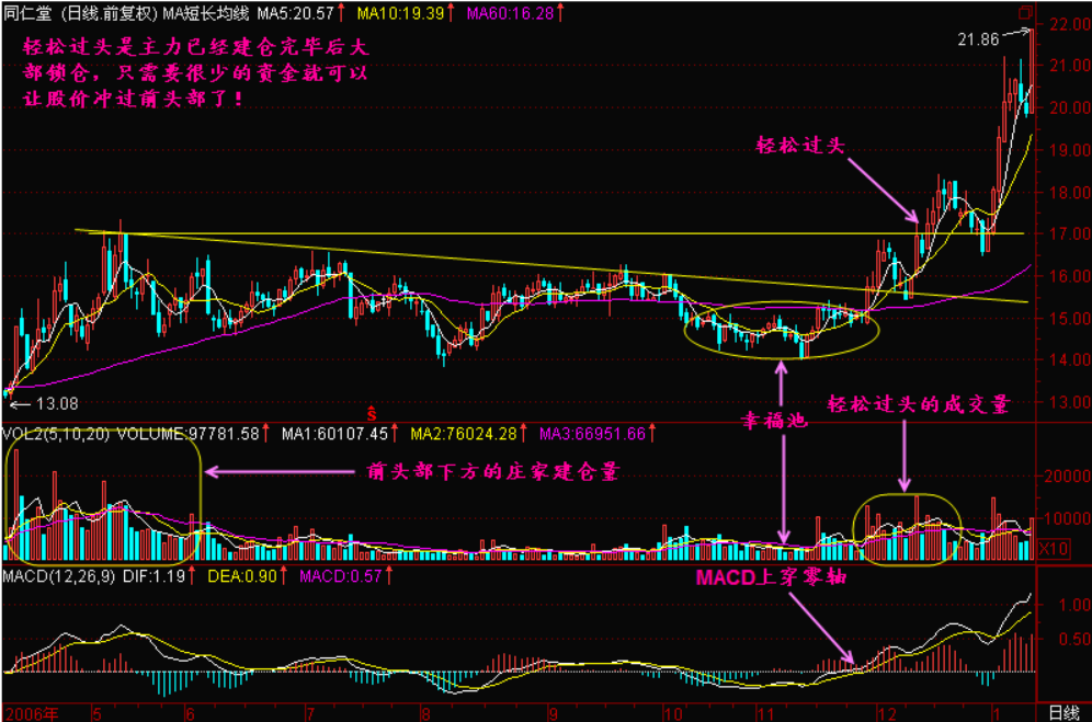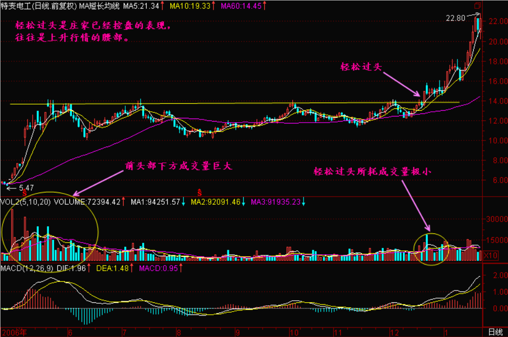 小结:轻松过头就是主力已经大部建仓完毕后出现的图形,一般轻松过头的位置是上升行情的腰部,但有些底部反复建仓,建仓较充分的个股也容易走出轻松过头的走势。