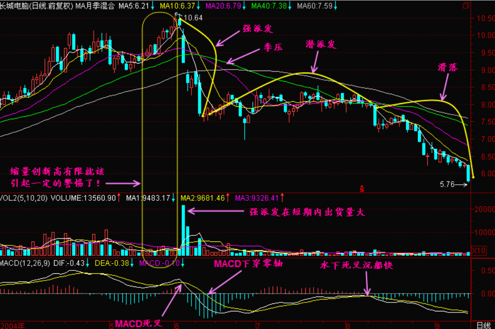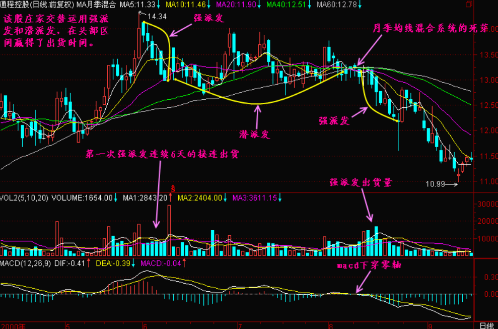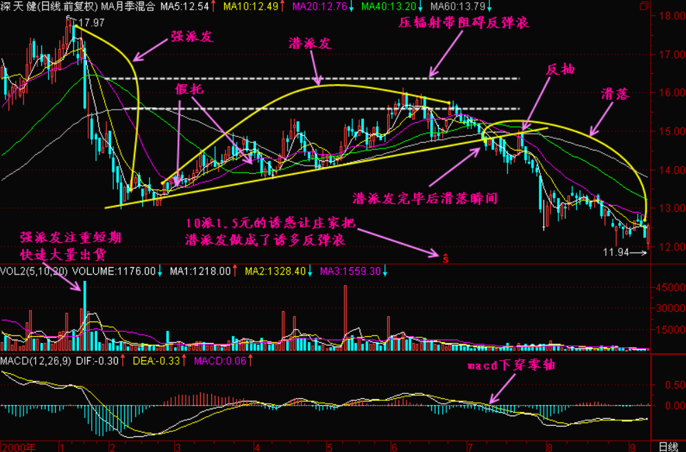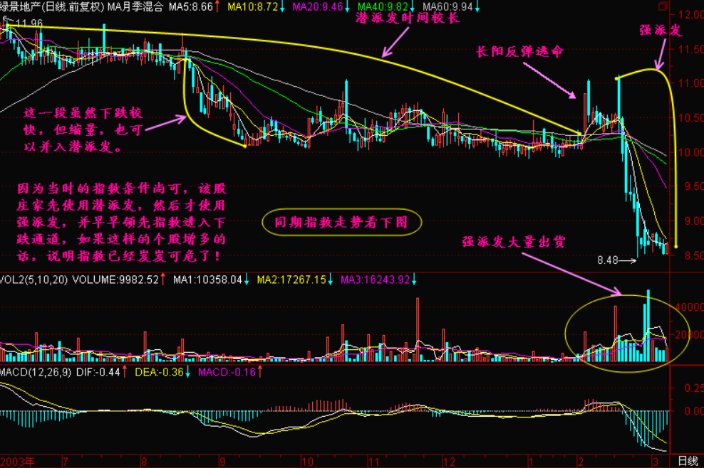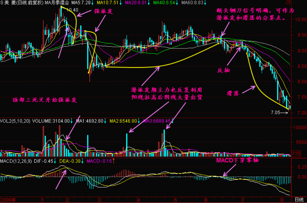 小结:头部区间出现的三死叉往往造成短期内股价下跌过快,成交量较大的特点,这就是强派发阶段,而如果此时指数条件尚可的话,庄家就会反复的在整个头部区间交替运用强派发和潜派发延长出货时间,直到货出得差不多了就开始进入滑落阶段。