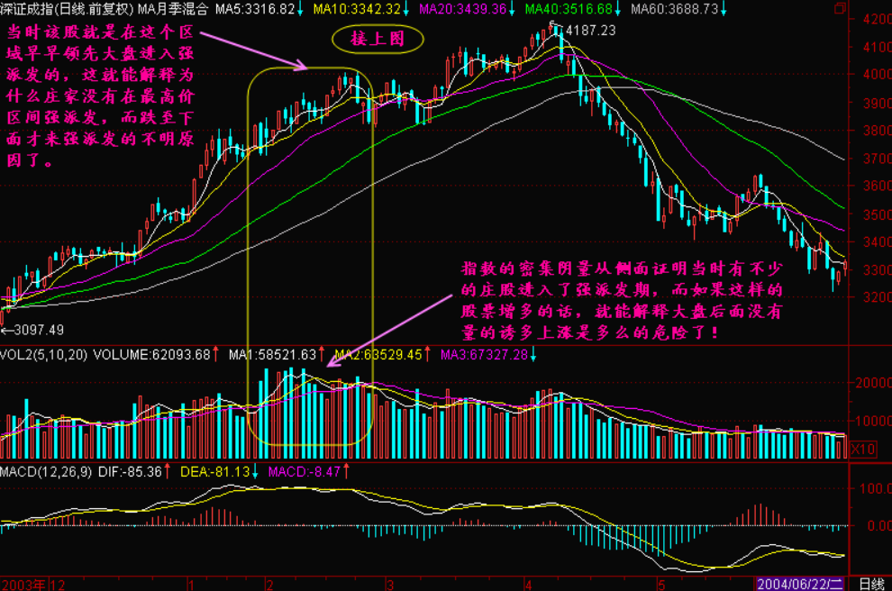 潜派发和强派发往往交替进行,庄家结合指数来合理地运用这两种派发方式,最大量地在头部区间清仓!