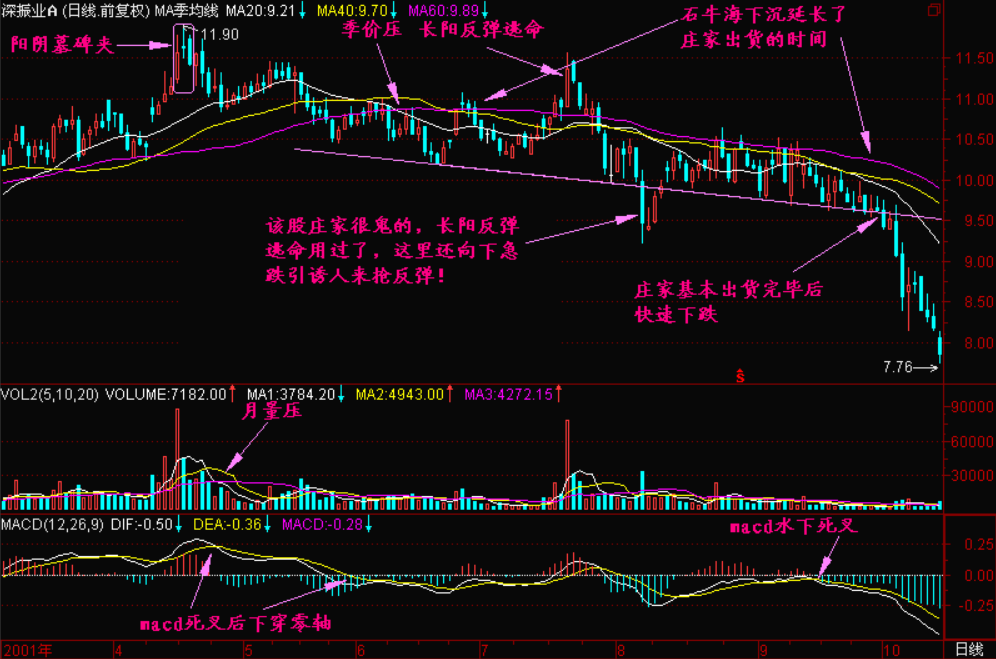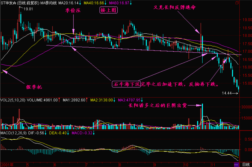 庄家拉高股价是为了进一步出货,于是股价再次回落。当股价过低不利于派发时,庄家再次拉高股价,如此反复使股价保持60日平均线的下跌斜率。