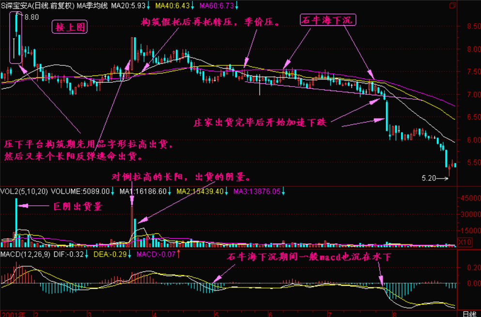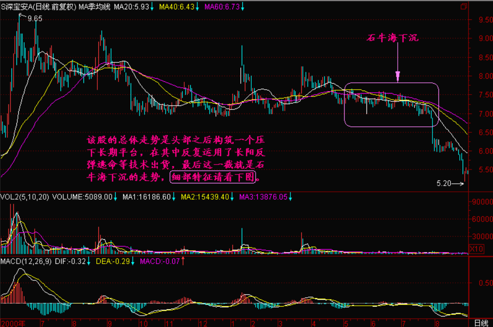 当股价跌破价压后,一般情况下呈自由落体。但是如果有庄家在其中没有完全撤退,则会走出石牛海下沉的走势。