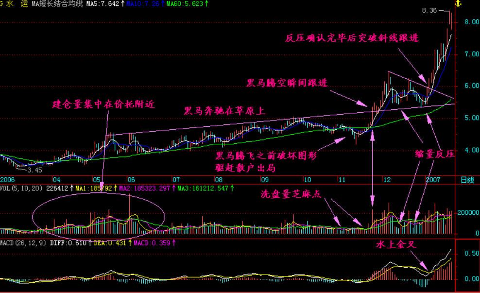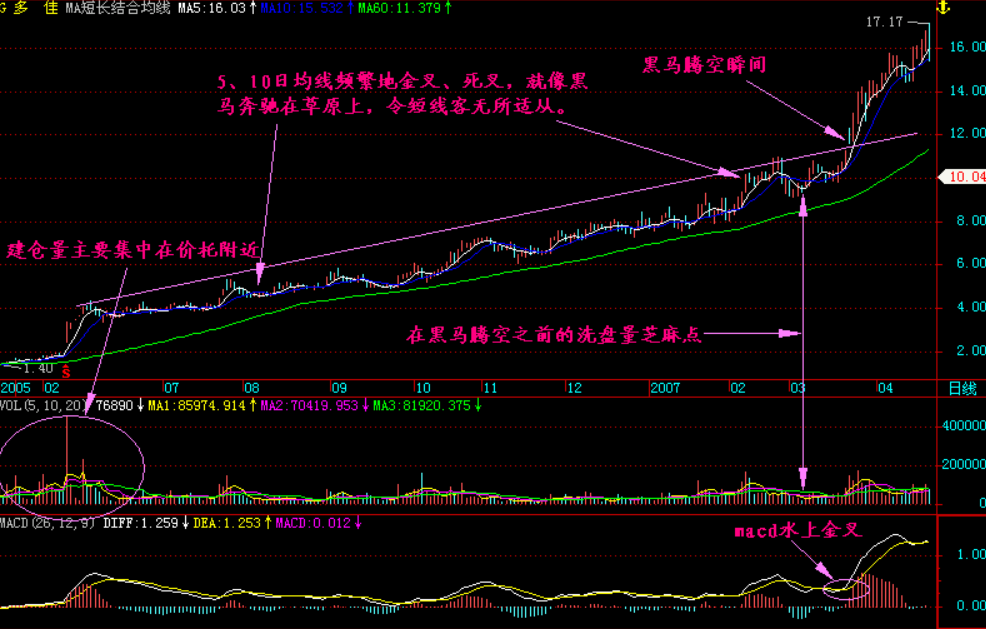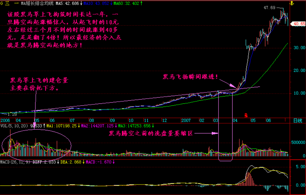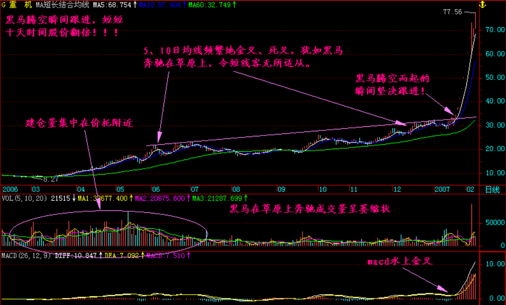 小结:黑马草上飞是庄家在低位的价托处大量建仓,然后在逐步地推高股价的过程中高抛低吸,他掌握了完全的主动权,可以在黑马奔驰在草原上的地方不断地做差价来获利,因为只有他知道什么地方要买,什么地方要卖,股价被他玩弄于股掌之间,其余的短线客很难在其中做差价获利。