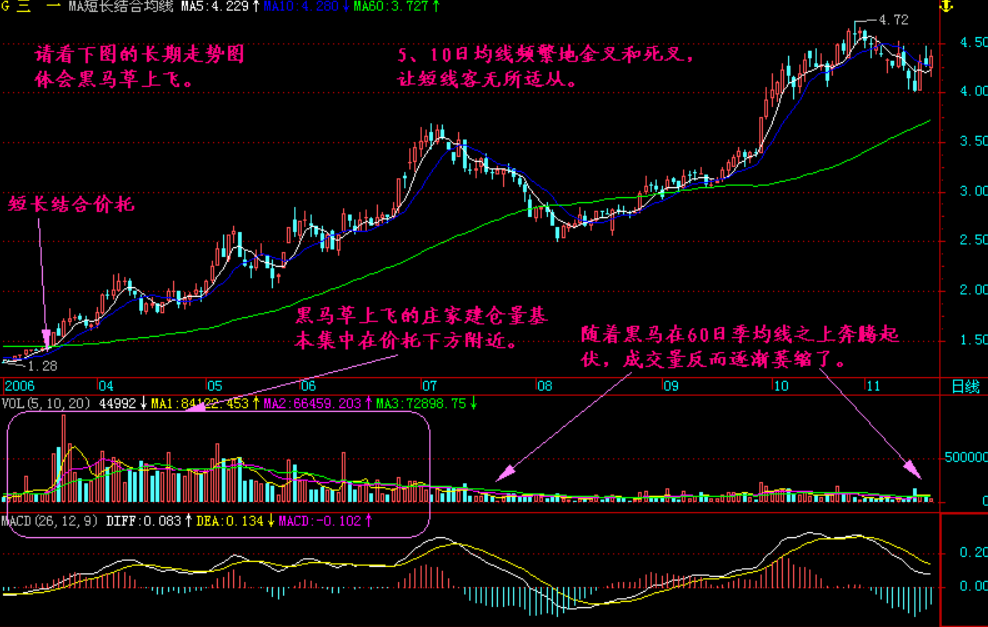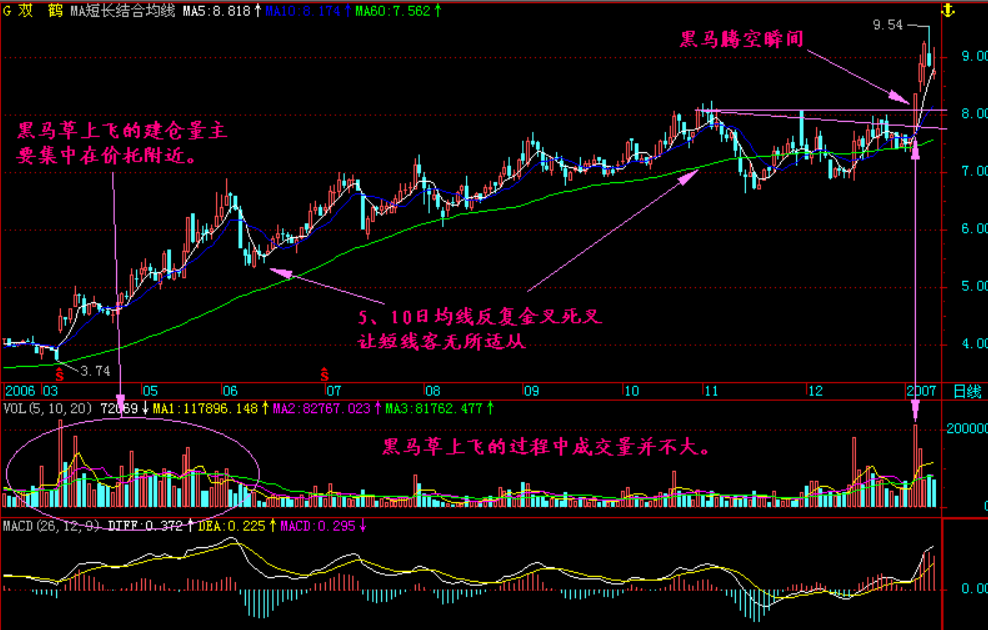 股价沿60日平均线运行,5日均线和10日均线反复进行金叉和死叉。每一次金叉都可能被短线客认为是进货的机会,但每一次又被死叉所覆盖。短线客很难在黑马草上飞的走势中做短差价。