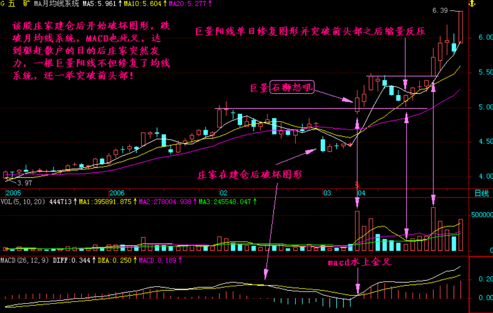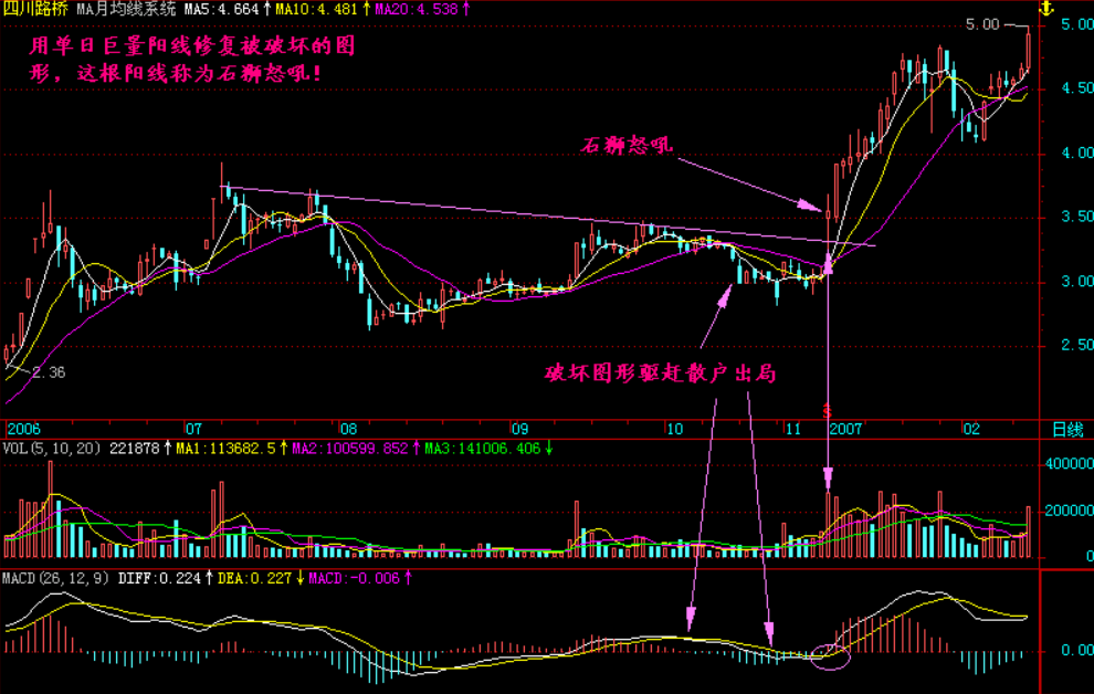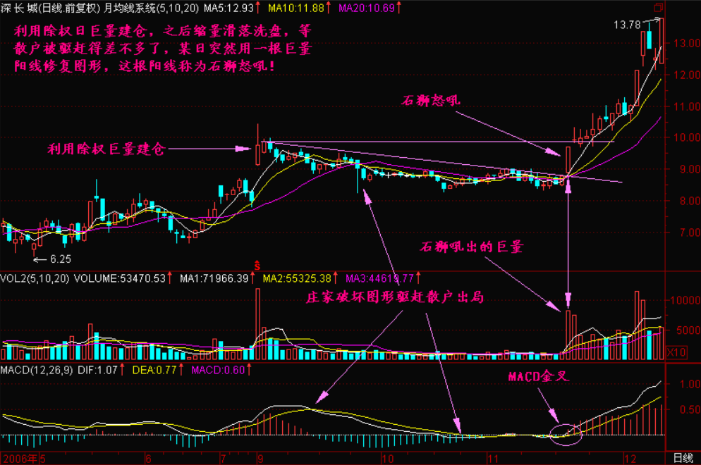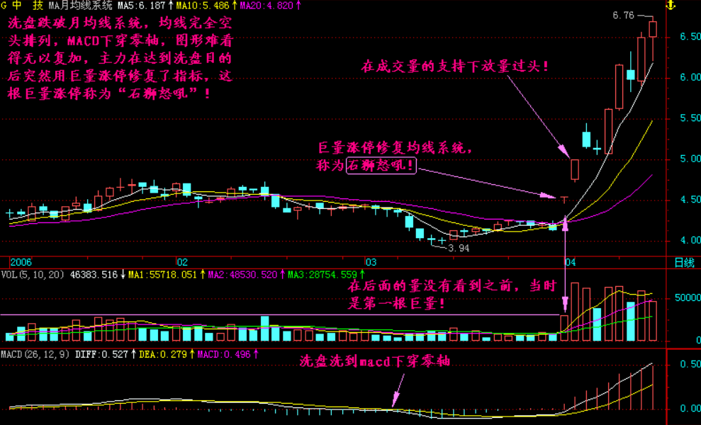 小结:庄家最怕的是建仓完毕之后散户跟进,这样就把他当成提款机了,那么一些凶恶的庄家洗盘往往较深,他把图形完全破坏,在基本达到清洗散户的目的之后他突然用一根巨量阳线修复被破坏的图形,这根巨量阳线就称为“石狮怒吼”,石狮怒吼的关键是必须放出巨量,否则就不大可能在后期通过前头部的压力!