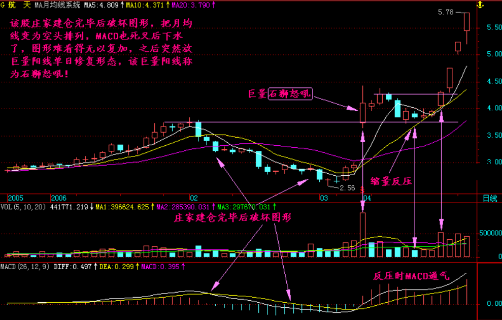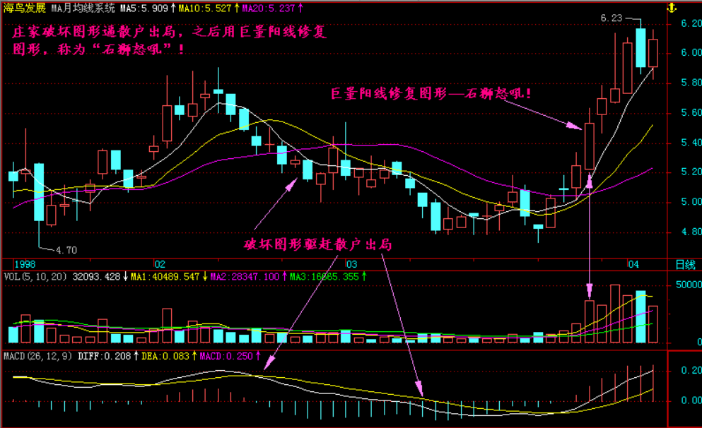 在庄家破坏图形后,如果突然出现石狮怒吼般的成交量和海鸟飞天般的长阳线一定要引起充分重视!