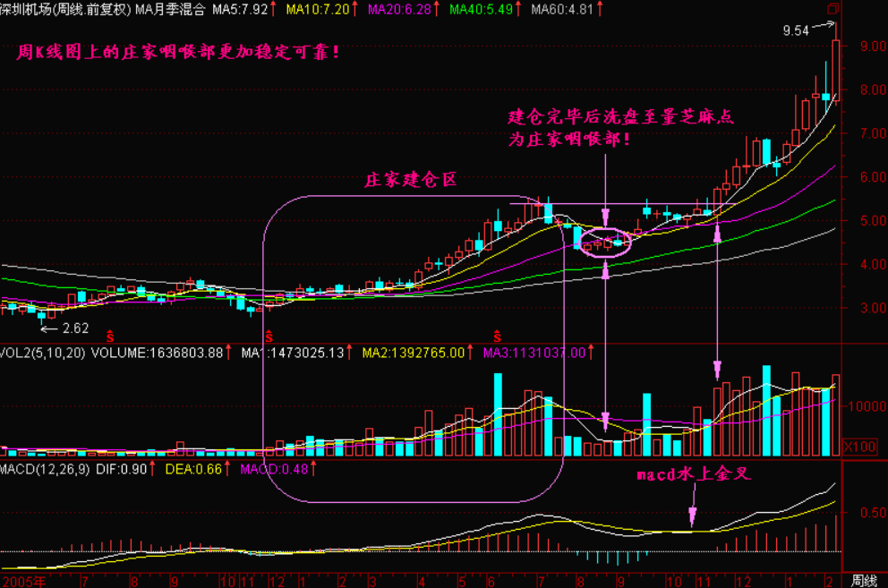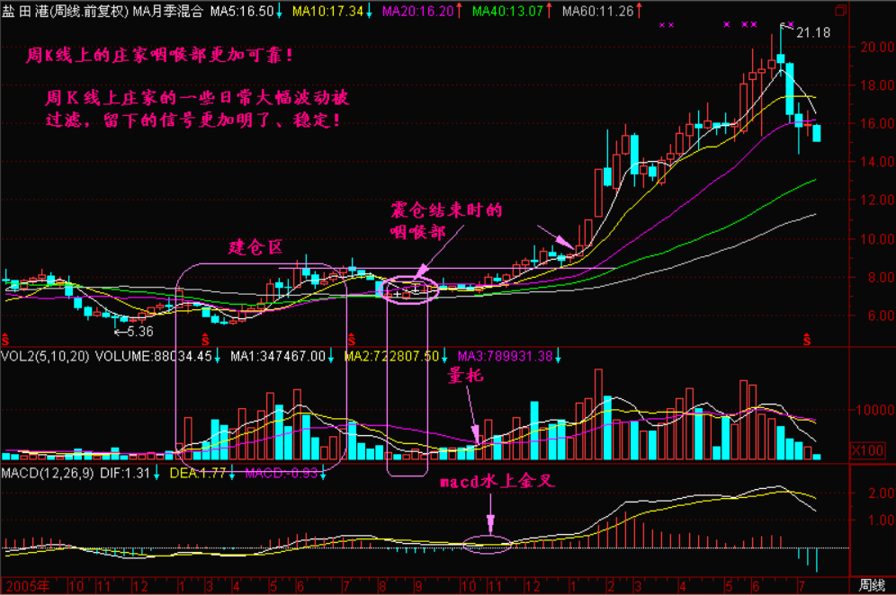 周K线上的庄家咽喉部,由于过滤掉了日K线日常大幅波动的影响,走势显得较为简洁明了,更增加了该技术的稳定性、可靠性!
