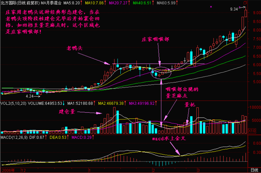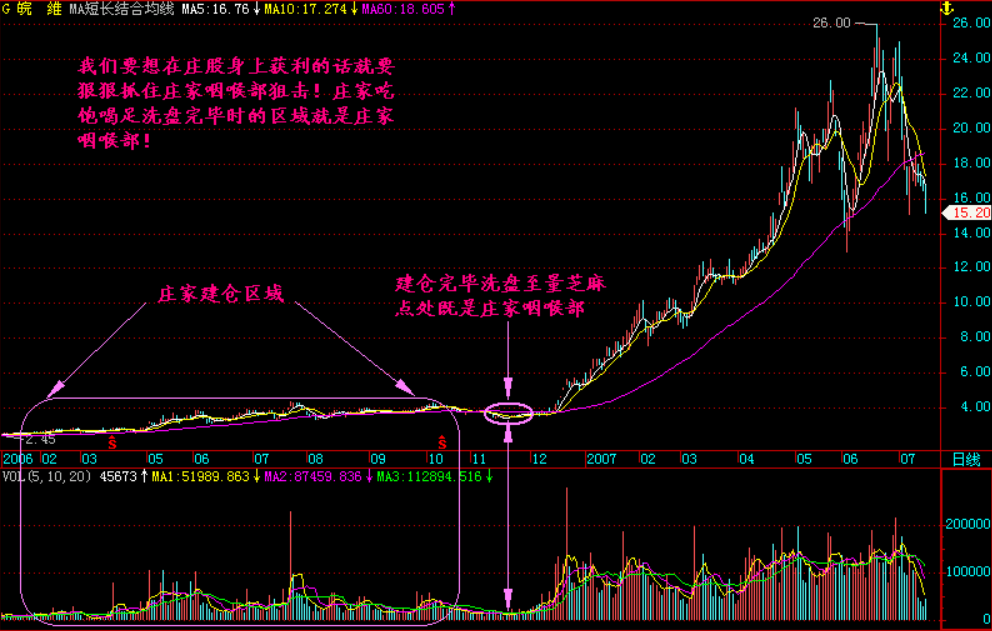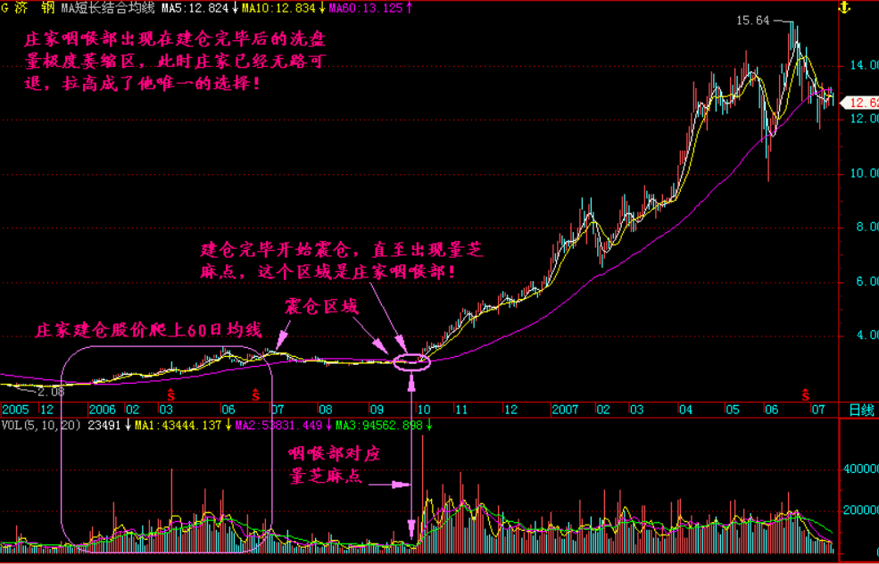 小结:只要有证券市场存在的地方,就不能杜绝庄家行为的存在,而对于庄股来说,他建仓完毕,并经历过震仓洗盘等一系列底部区间的准备工作,那么这就是庄家十月怀胎完毕的时候,这个时候庄家已经没有了退路,拉高出货成了他唯一的选择,这个时候就称为“庄家咽喉部”!