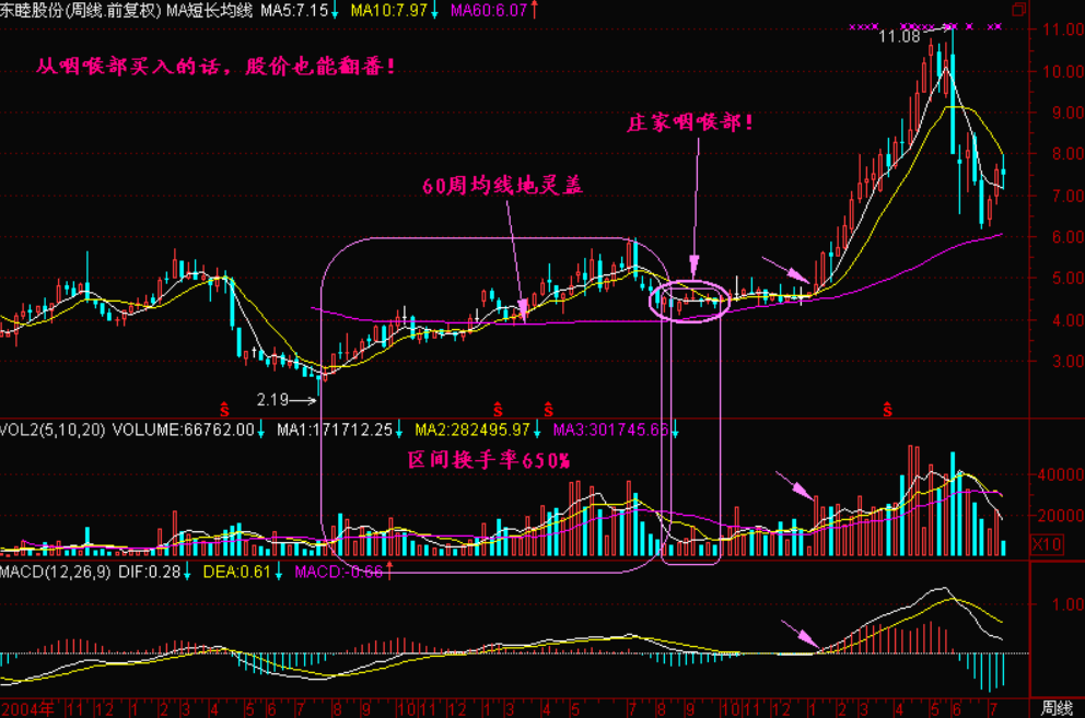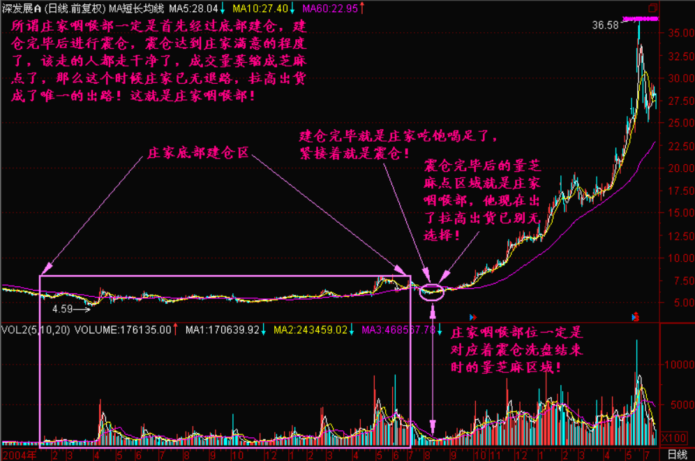打一个贴切的比方,如果把股票比做一只大纸箱的话,我们一般要等待庄家把头伸进去(试探性建仓)、胸也钻进去了(开始大量建仓了)、最后连屁股大腿统统钻进纸箱里面了(经过建仓完毕后洗盘也完毕了),我们就找合适的点位打进,这就是庄家咽喉部,在没有走完以上的步骤之前,庄家有可能反悔不干的,但如果把以上每个步骤都经历过了,那么他想再反悔就很难了,只有华山一条路“上涨”!