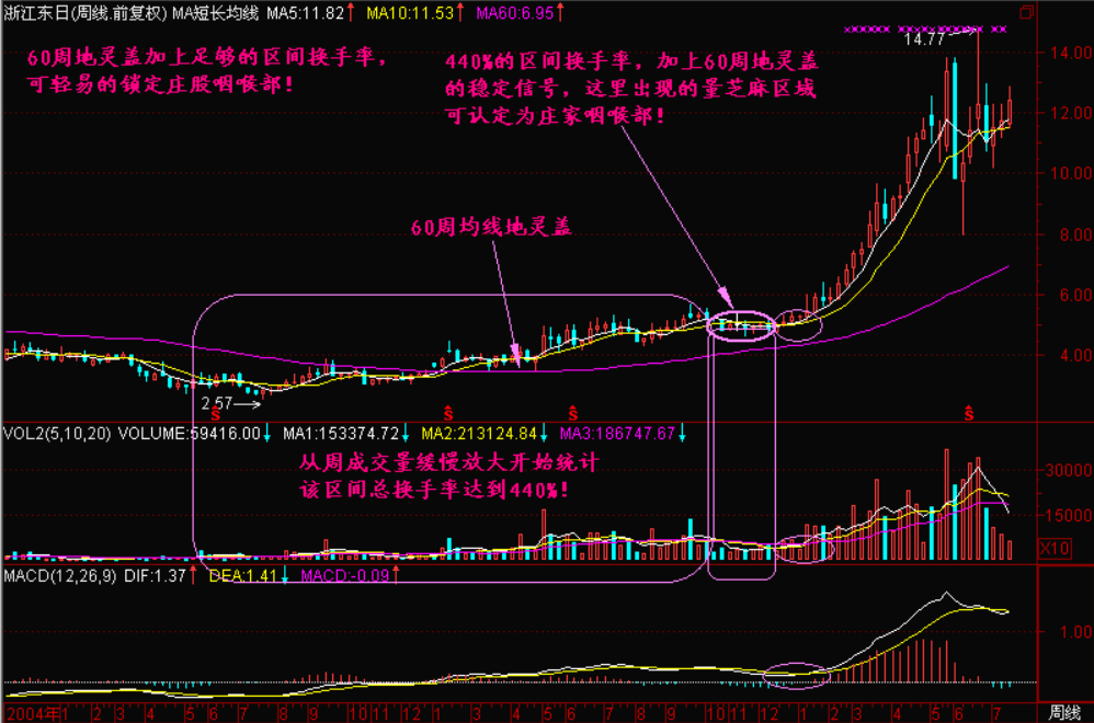 第一点:周K线60周均价线必须得出现地灵盖,否则不容易出现三线顺上的拉升行情,那么之前的量芝麻区域就不一定是庄股咽喉部;