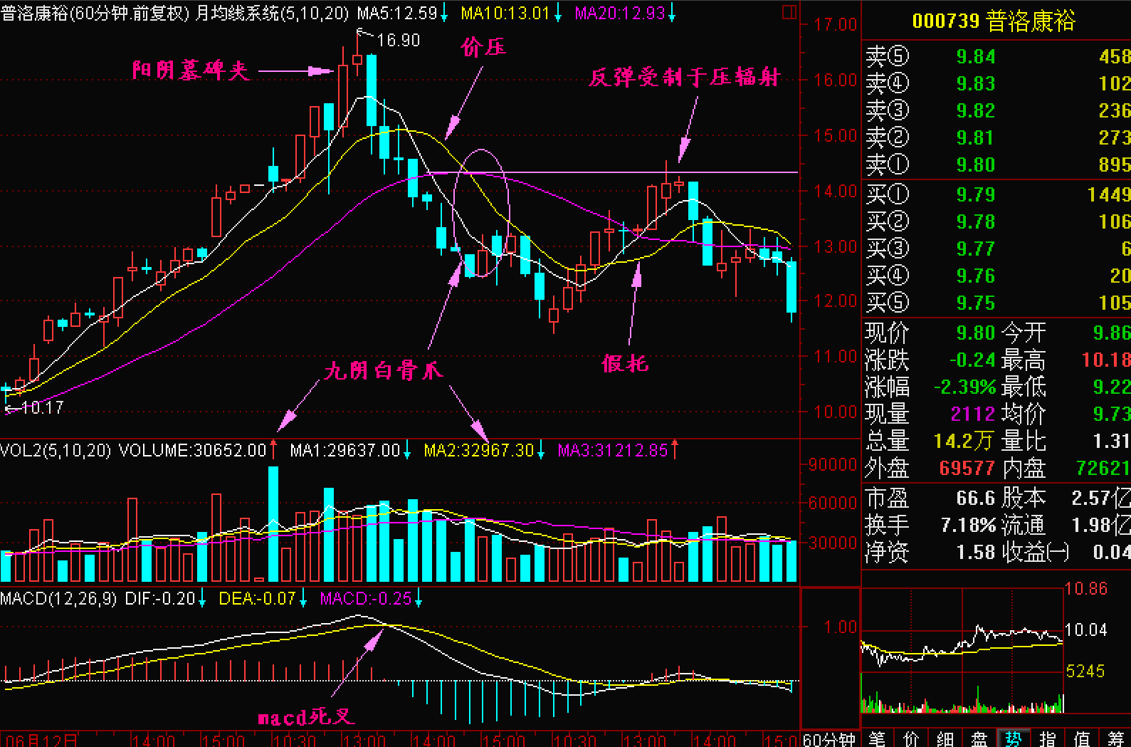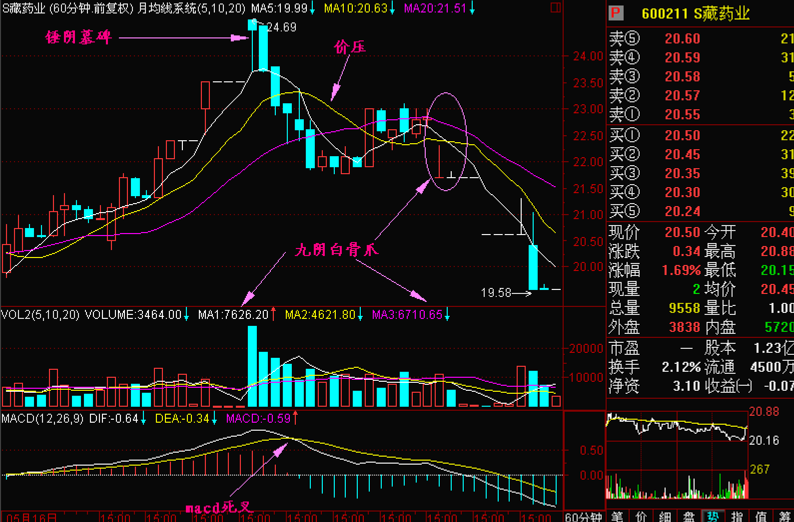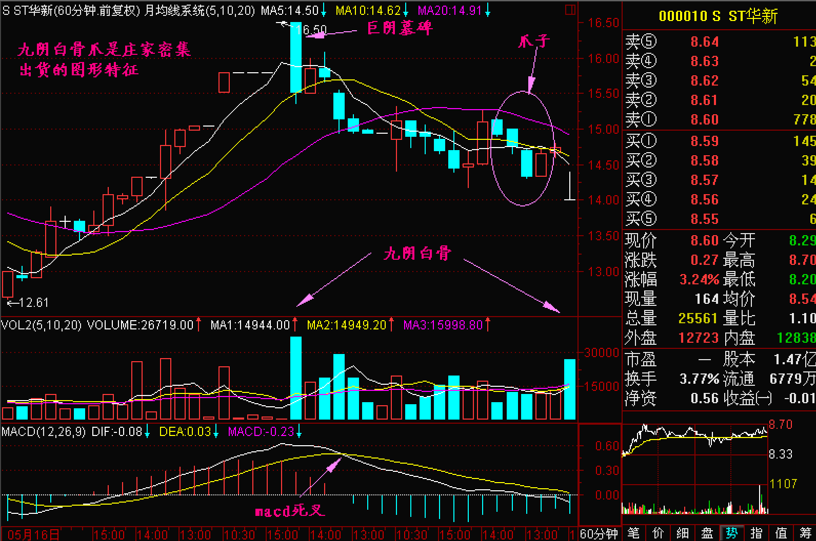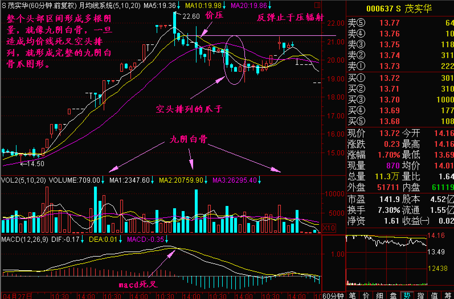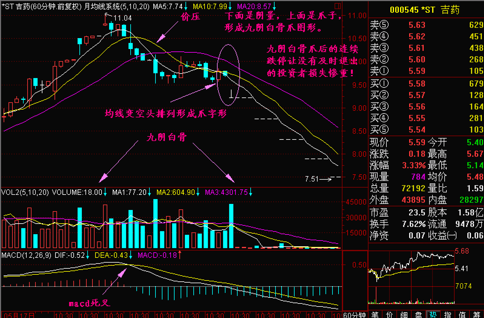 由于股价开始滑落60分钟K线图上的5、10和20单位平均线会出现向下的“爪”字形,称为九阴白骨爪。