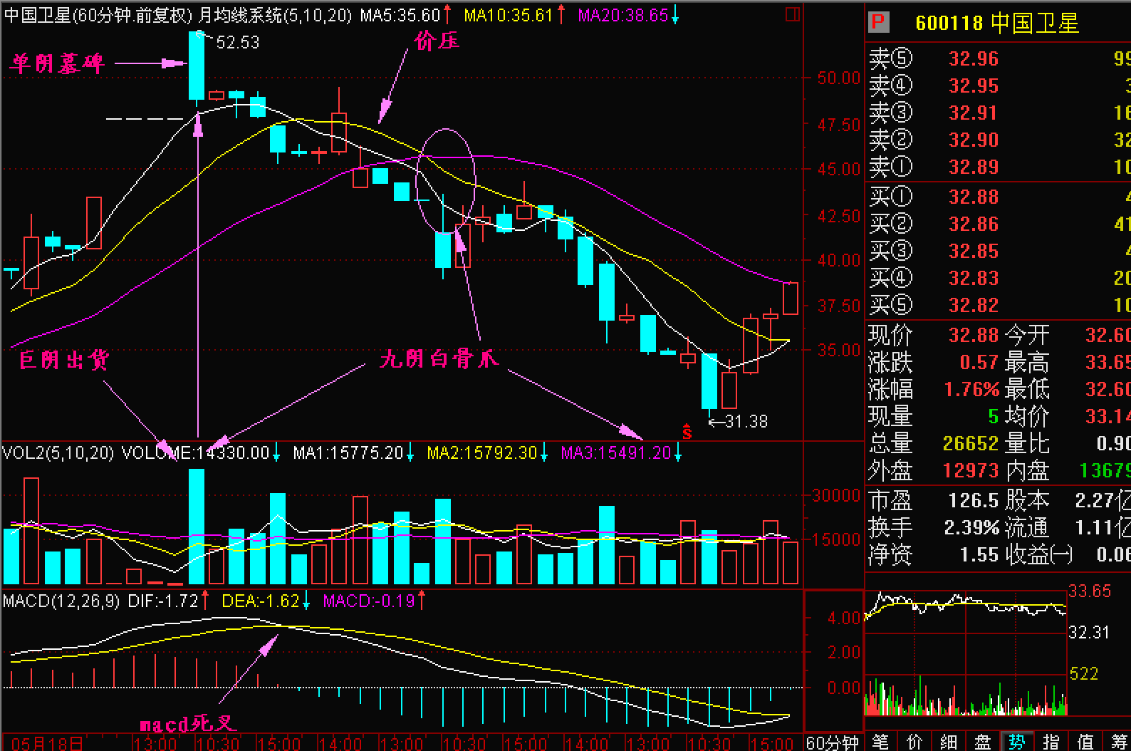 当股价形成头部时,必然是庄家大量出货的区间。因此,在60分钟K线图上会连续出现阴线。而且在分析软件的量柱体图上连续呈现白色长柱体,有时多达九根阴线,称为九阴白骨。在日K线图上出现九根阴线的机会不多,但多阴白骨爪的图形还是挺多的。