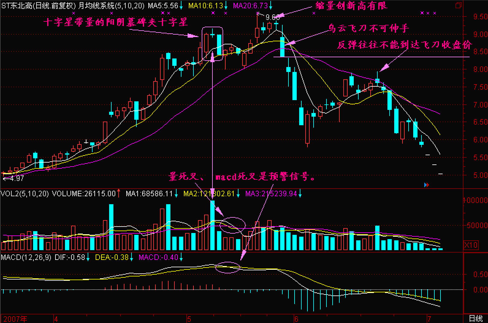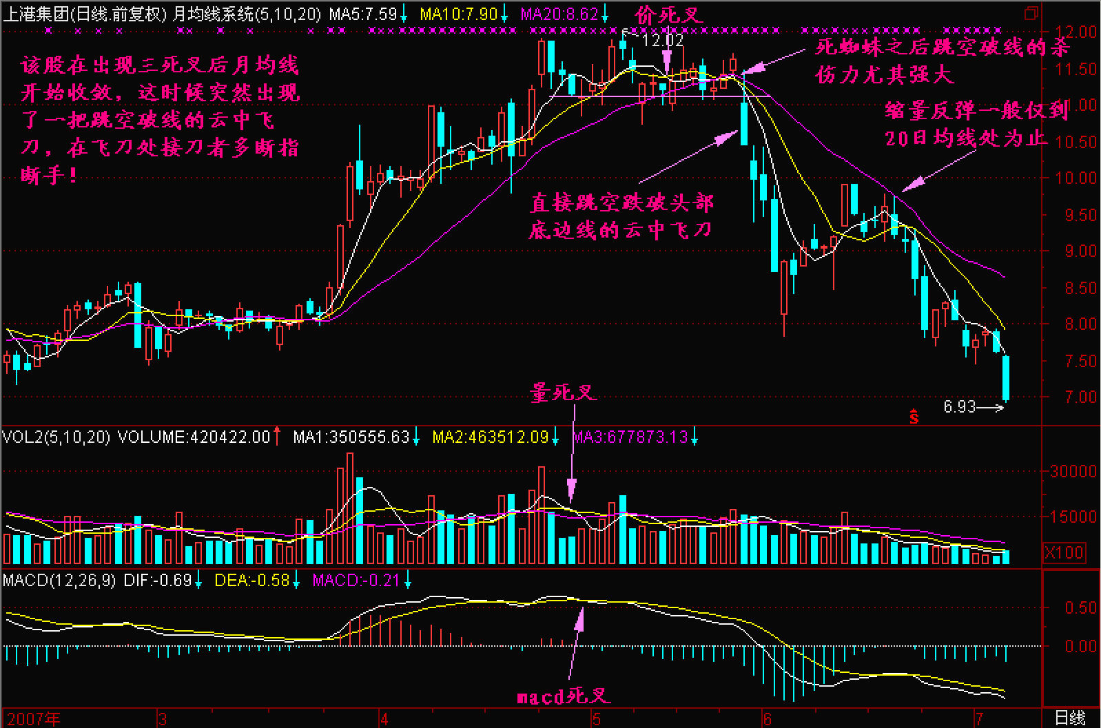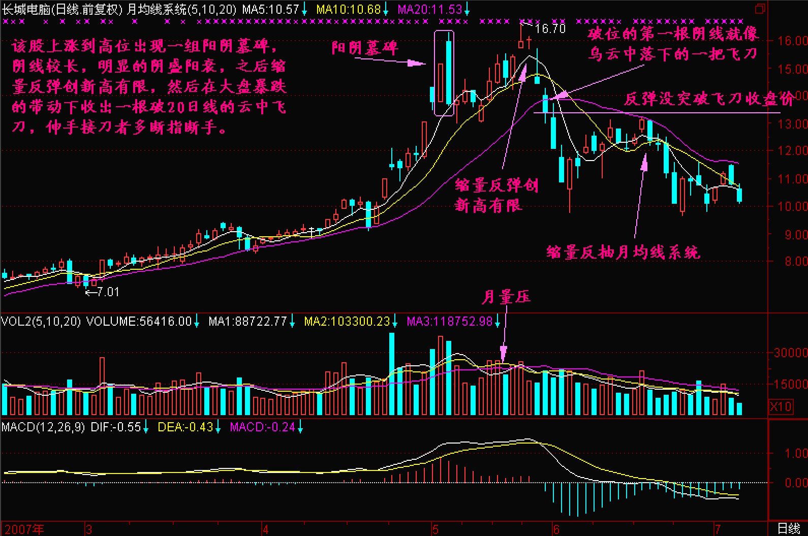 小结:所谓乌云飞刀,乌云说明是股价已经到高位,上升乏力了,这时候往往抛压加重,犹如乌云压顶!如果此时出现跌破均线系统或头部底边线的第一根长阴线时,这第一根长阴线就称为“乌云飞刀”!