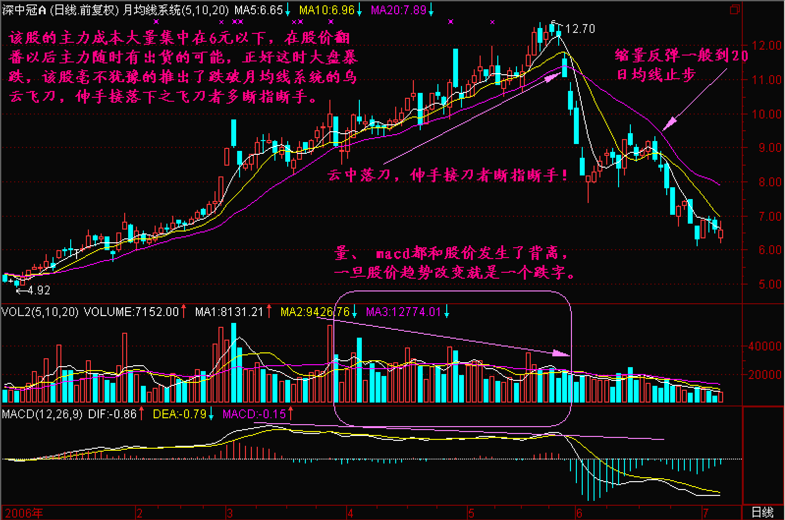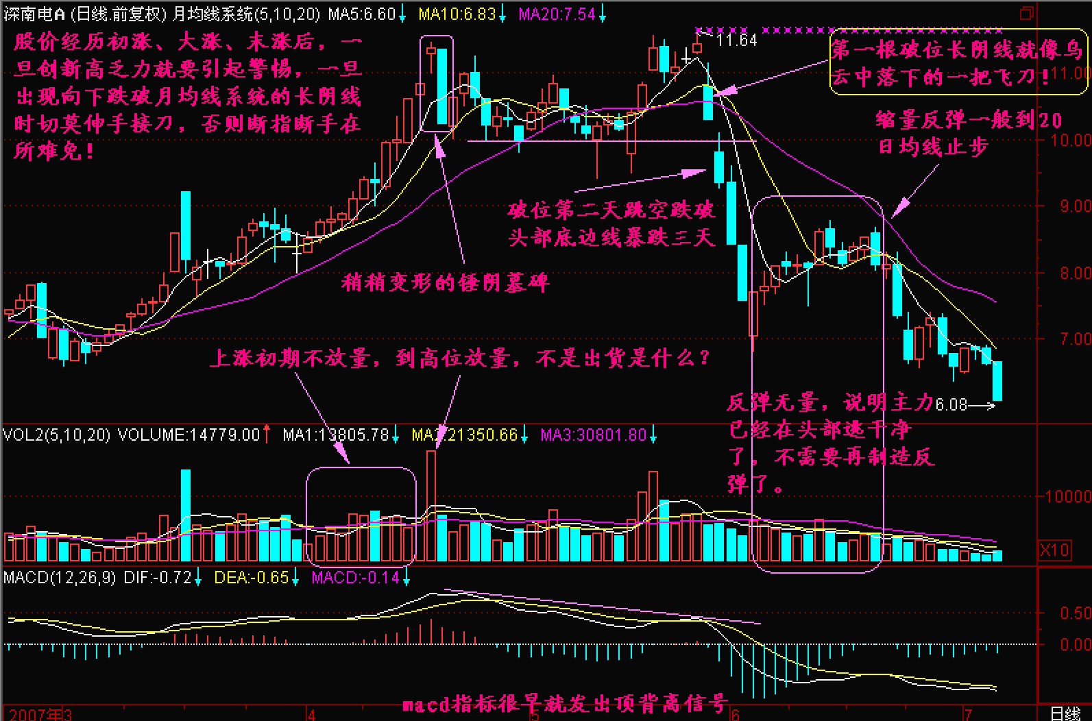 股价经过初涨、大涨和末涨后就到达了头部区间,在这里庄家要完成派发的过程。通常主力将分批小量地逐步派发,此时股价还能维持小涨或盘整的格局。而后主力加大派发力度,成交量开始逐步放大,股价开始下滑,带上影线的小阴小阳线形成一个头部区间,这说明上档的压力越来越大。当主力库存大部分派发完毕后股价已到了跳水的边缘,市场已感觉到股价力不胜任,越来越多的散户、大户也加入了卖出的行列,于是下跌速度加快,终于股价跌破20日平均线,跌破头部平台的下边线,于是股价呼啸而下,犹如乌云中跌出一把黑色的飞刀,高悬在空中。由于强大的卖出力量并没有释放出来,第二三天很可能有更大的卖压,并连拉几根长阴线,因此第一根长阴后的轻易买入是相当错误的。这犹如用手去接空中下来的飞刀,其风险是可以想象的。