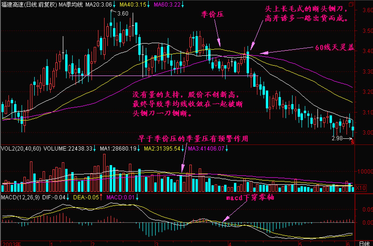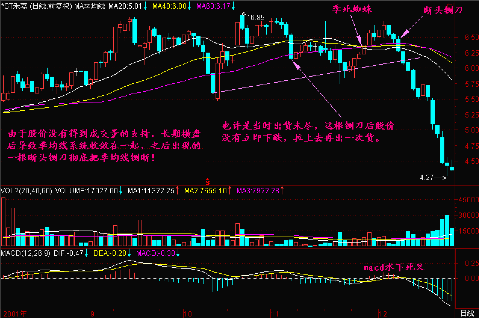 下图的个股有些特别,该股先是出现一次对季托平台的假突破动作,之后反身向下跌,在季均线系统收敛的情况下出现一根断头铡刀,醒悟过来的投资者纷纷加入到杀跌行列,可惜因为大家都要出货,而接盘的人并不踊跃,所以造成了缩量快速下跌的局面。