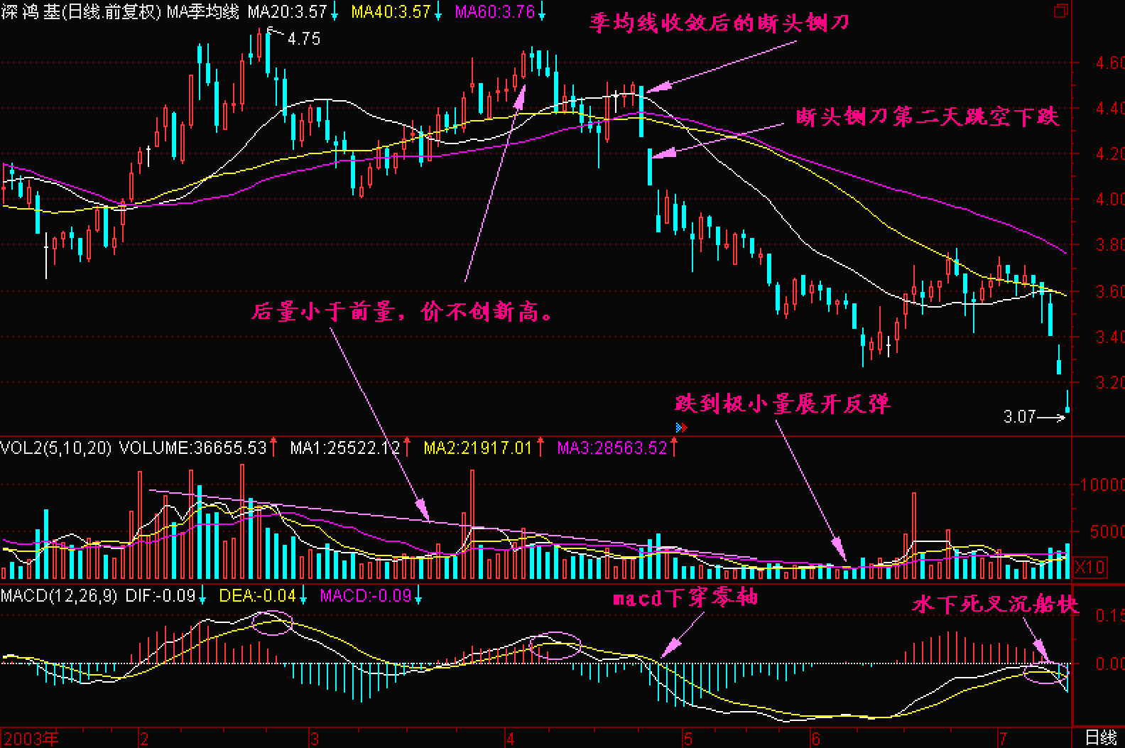 小结:有效的断头铡刀一般出现在均线系统相对收敛的情况下,如果均线系统不收敛的话,就可能演变为“大刀砍”了,因为均线系统不收敛的话暖空气的力量会把股价抬得弹跳起来的,所以大刀砍后必有弹跳就是这个道理。