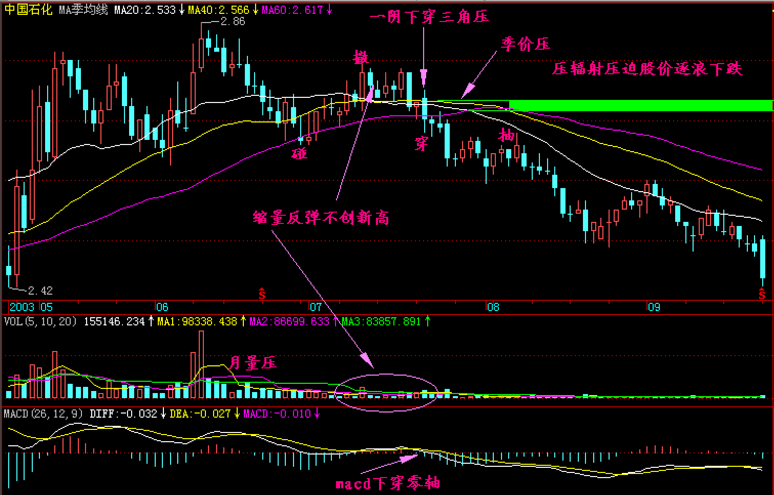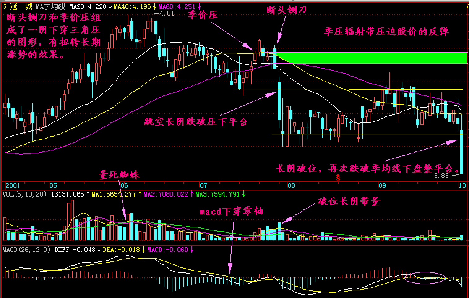 如果是小阴线断头铡刀的话,则要求之前季均线系统要相对收敛,这样出现的断头铡刀就叫“致命小铡刀”,配合上价压也是杀伤力极大的!