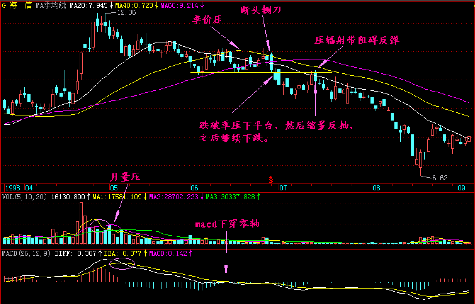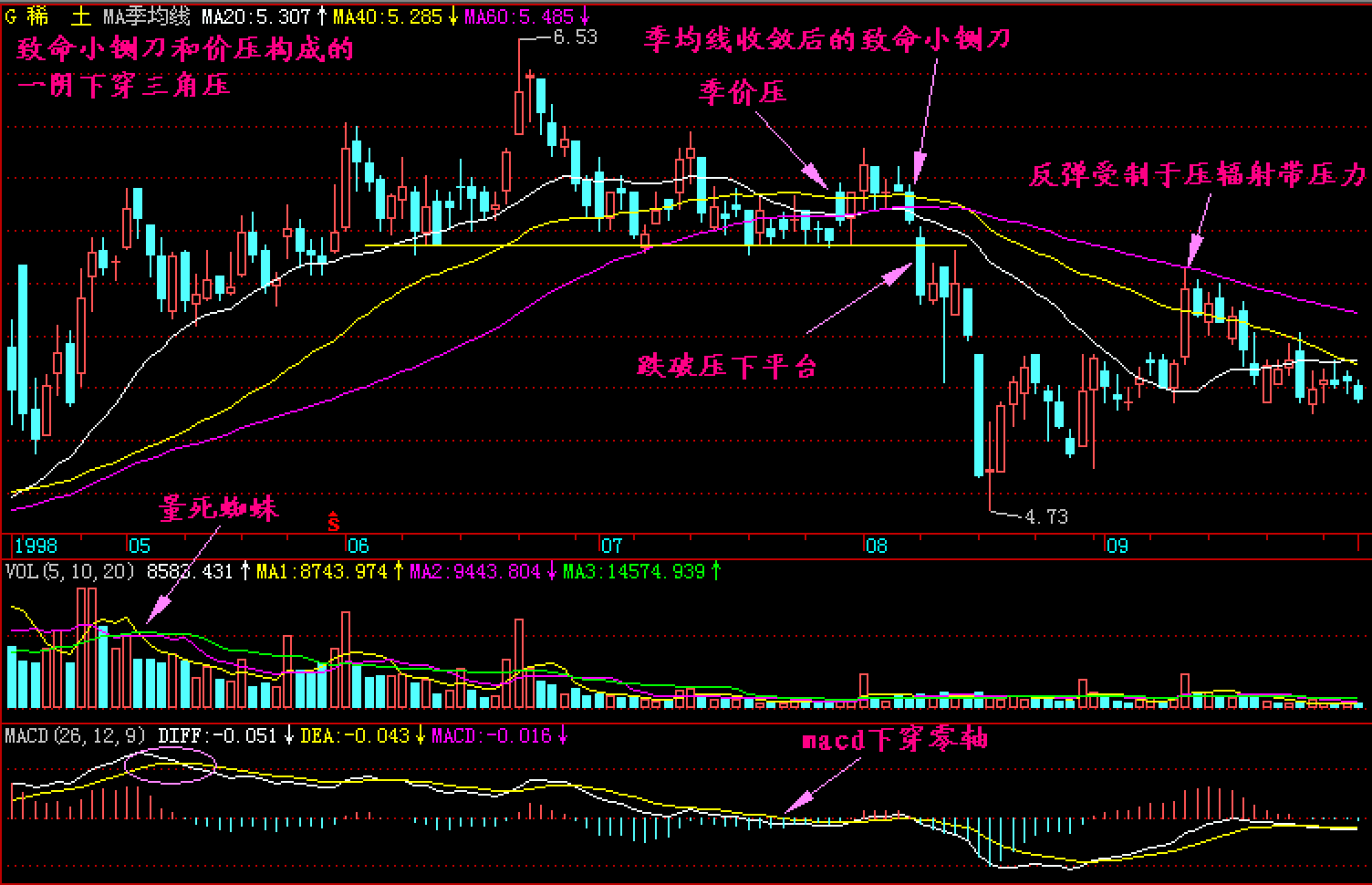 下图的走势是季均线系统收敛后的一根致命小铡刀与季价压共同构筑的头部。