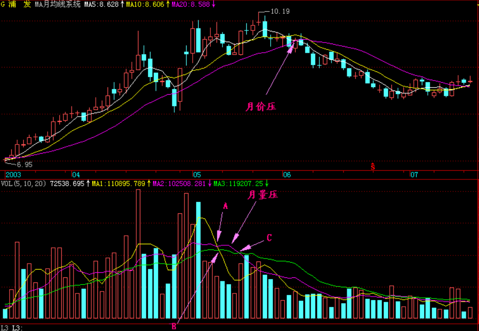 以月量压为例,图中A所指是5日均量线死叉10日均量线所形成的结点,图中B所指是5日均量线死叉20日均量线所形成的结点,图中C所指是10日均量线死叉20日均量线所形成的结点,由这三个结点封闭构成一个三角形,这个封闭的三角形就称为月量压。
