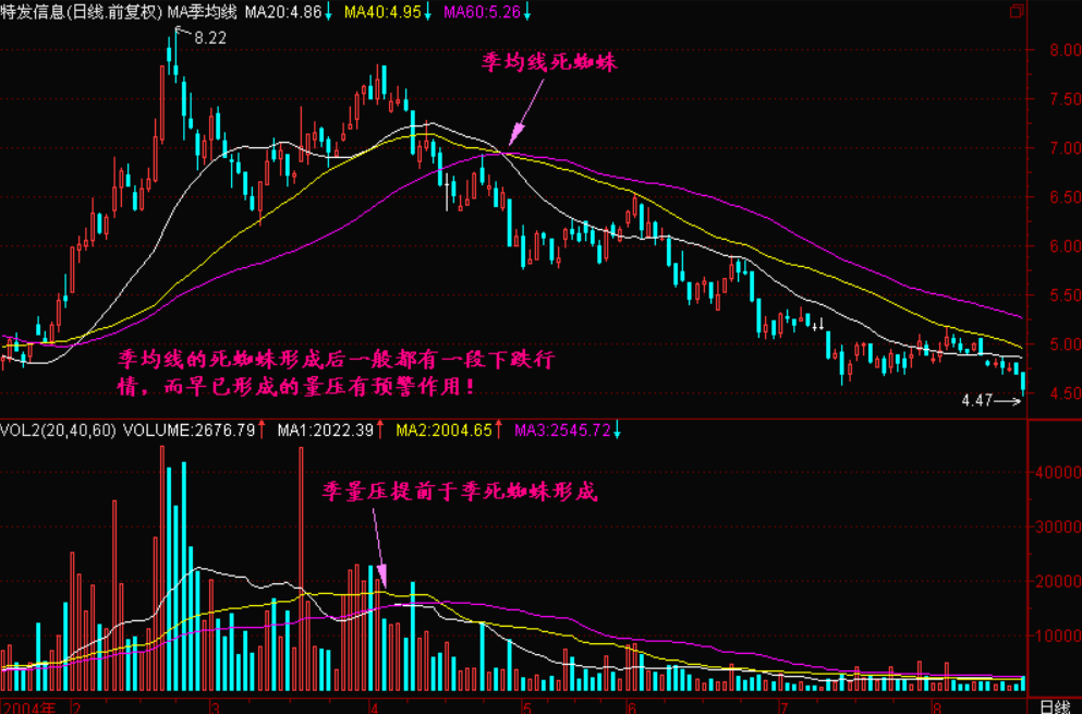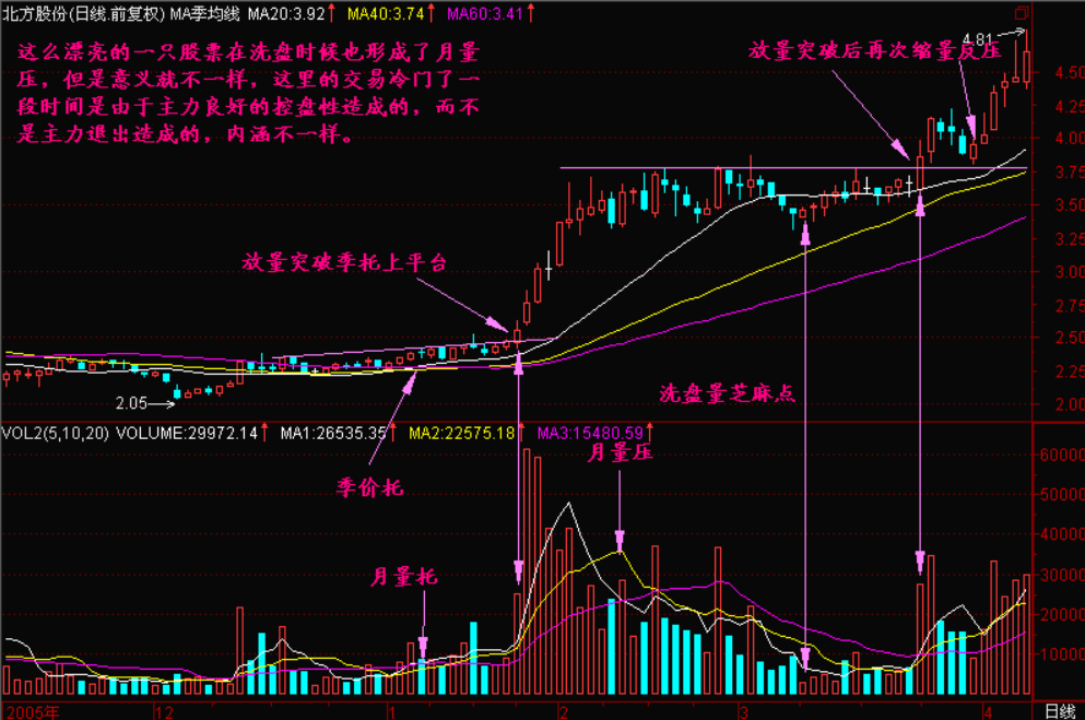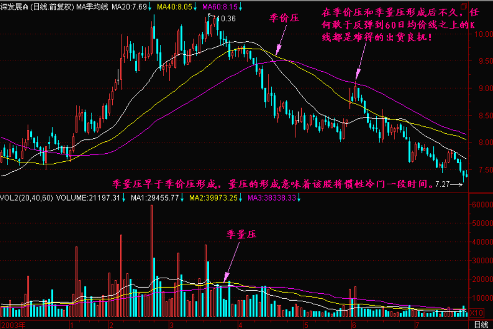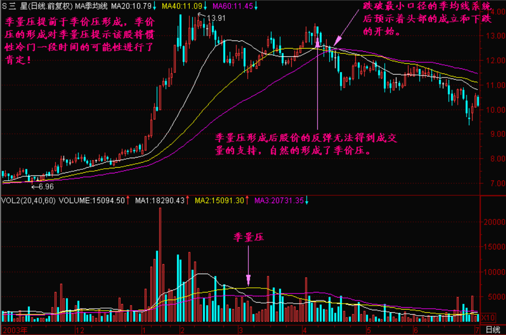 下图是一个季量压的案例,季量压的形成意味着该股将会惯性冷门一段时间。见(图15-2)