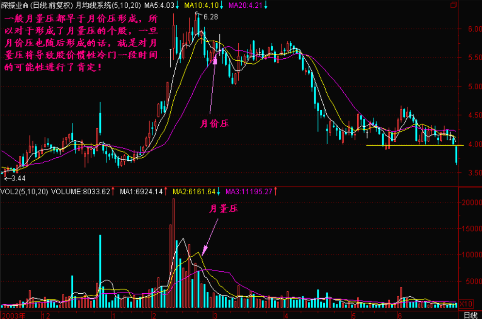 在月量压形成后的一段时间内,成交量不会很快高于月量压以上的成交量柱体高度,意味着该股将惯性冷门一段时间。