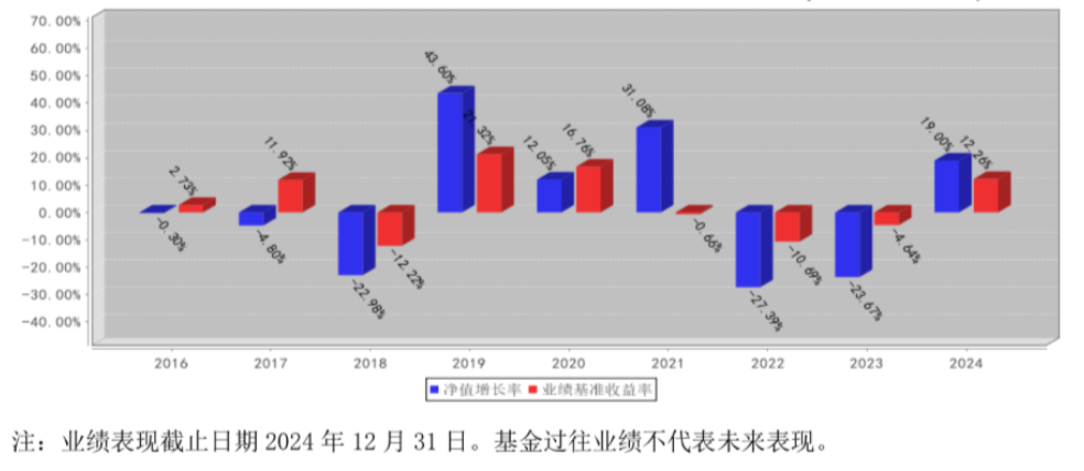 这只基金9年运作历程中仅3年跑赢基准,且收益波动剧烈:超额收益年份的涨幅远超基准,如2019年净值增长43.6% ,当年的业绩比较基准为21.32%,但亏损年份的跌幅也翻倍地跌,如2022年净值下跌27.39%,而基准下跌了10.69%。